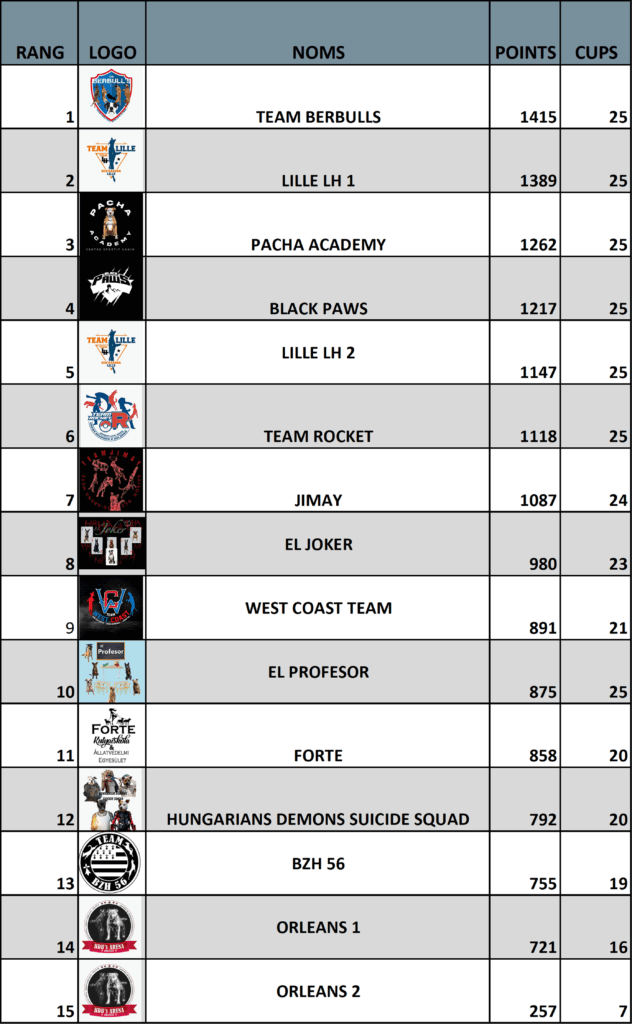Team Challenge, est un championnat par équipe avec une équipe vainqueur à chaque saison. Une Team doit être composée de 5 chiens, avec la nomination d’un capitaine, et un nom unique de TEAM. Pour inscrire votre équipe,